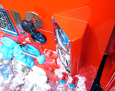 ▼消防団のために専用設計された高機能車両です。▼車体は左右非対称構造となっています。▼左側後部は展開式ステップと資機材スペースとなっていおり、消火用の無反動巻鎗、スタンドパイプ、双口分岐、消火栓ハンドル等、これまで収納しにくかった物品を効率よく収納しています。▼右側には8m吸管を常時接続しており、もう一本の吸管は車両上部積載しています。▼また、放水コック、中継コックは左右の第一放水コックを除き、縦方向に配置しました。▼また、オーバーハングメーターは計器に対して適正な位置に正対できるように角度を30度に設計しています。▼この車両はこれからの消防団車両のあり方を考慮した、ベンチマークとなるでしょう。