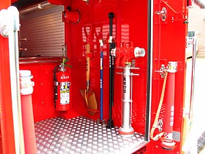 地域の特性を考慮して専用設計された分団仕様のCD-1です。狭路に対応する為オーバーハングを短くとっています。車輌後部は定員2名と資機材スペースとなっておりスコップ、かけや、消火器、スタンドパイプなどを効率よく収めています。