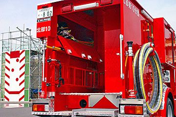 ▼このCD-1型は地域の特性を考慮して専用設計されています。▼車体は左右非対称構造となっており、左側後方上部には、内側からアクセスする大型の資機材庫が設けられています。▼この資機材庫には柱が無い為、1760mmも長尺物を収納することが出来ます。▼右側後部は吸管の伸長を考慮し、吸管上部には障害物が無いように配慮されています。▼また、車両後部には加納式ホースカーが積載されています。後部の床部分は操法の際にリヤエンドより、300mmの位置に二重巻きホースを搭載できるように、折りたたみ式となっており、ワンタッチで展開、収納を行うことが出来ます。▼また、デパーチュアーアングルを大きく取る為にリヤステップはテーパー状に切り上げられ、サイド部分には車幅灯を埋め込んであります。▼搭載しているポンプ装置はNF75ハイパーエンジン、高効率サクションとNRVSⅡにより吐水口付近に溜まる圧縮空気を完全に排除、送水を安定させ、送水スピードを向上させます。